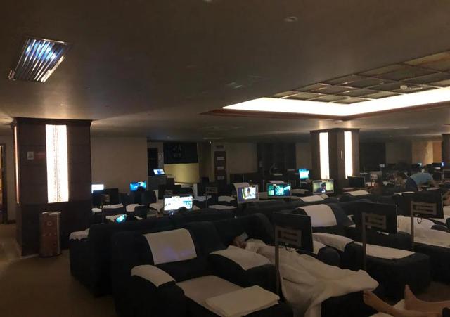二楼区域是休息区,主要是按摩区、ౠ躺椅区和客房。休息区的躺椅数量是有限的,每个躺椅上还配了电视机,如🍸果坐满了,那只能坐椅子上休息了。客房是需要额外收费的。