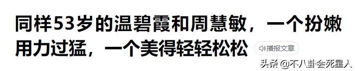 因为温碧霞扮嫩太用力过度了,她还被拿出来和同岁的周慧敏对比,网友们称周慧敏是“美得轻轻松松”,而温碧霞是“用力过度”。
