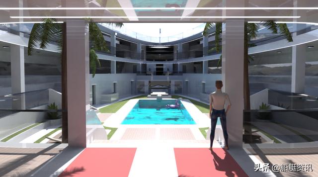 另一个不寻常的特点是双直升机停机坪,它们像机翼一样位于驾驶室的两侧。每个着陆平台从船侧延伸 5 米,并将概念的 22 米船宽增加到 33 米,这将使“Sovrano ”号成为世界上最宽的超级游艇。该空间还可以转换成一个游泳池,甚至可以用作一个平台,可以通过四个电动绞盘将其升高或降低到水线上。
