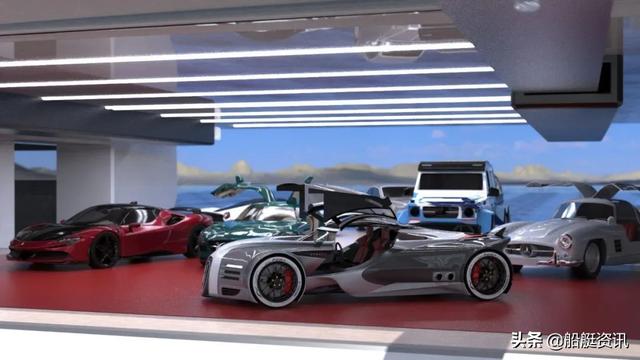 另一个值得注意的地方是船尾,它装有两台连接到升降平台上的起重机,用于装卸各种车辆。该区域直接连接到一个艇库,该艇库可以容纳两艘15米长的附属艇和六辆跑车。附属艇可以通过艇库侧门直接下水,而汽车和其他陆上玩具可以被推到船尾甲板上用起重机吊装。