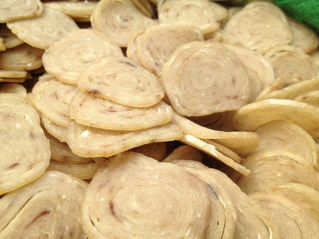 鱼面鱼面,是鱼非鱼,是面非面。麻城鱼面又称锤面,以鲜鱼为原料,加上红薯粉、鸡蛋清、食盐等材料锤炼,锤炼后的面团擀成薄面𓆉饼,卷成卷,蒸熟晒干而成。
