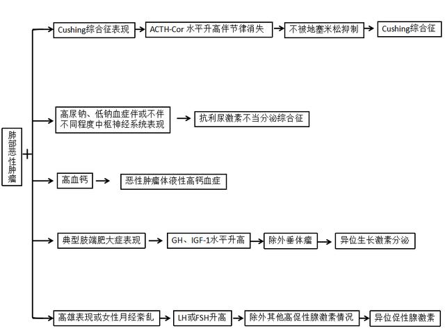 肺部肿瘤分泌激素,从而引起一系列内分泌临床综合征,从属于副瘤综合征范畴,如图1所示。