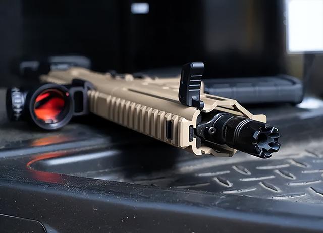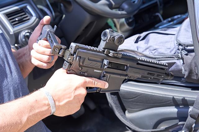 CMMG的Dissent虽然说是AR15类型的步枪,但是和传统的AR15区别还是蛮大的。传统的AR15在机匣尾部带有缓冲管,复进簧是塞进枪托里的,用来增加枪机运动距离,去降低后坐力。而在Dissent上面,这个缓冲管则取消了。毕竟这玩意儿打的广告还是短小,需要将枪托折起来ꦰ,ღAR15的缓冲管的存在,是没办法用折叠托的,即便是用了,也没什么意义。