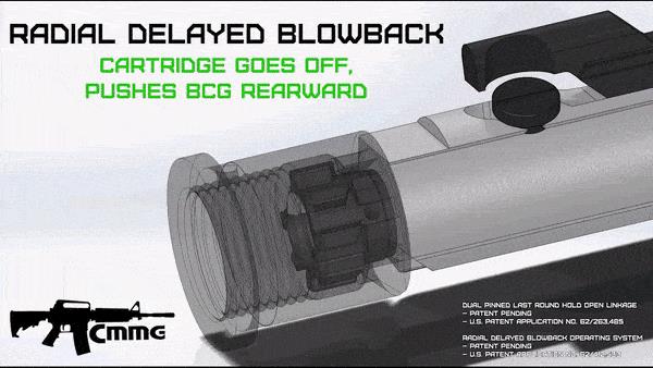 CMMG的Mk9和Mk57都是运用的这种原理,这种原理下,气体在向后冲的时候,会作用在机头上,等枪机后坐之后,运动到机匣的位置时,能量也大幅度降低了,这样的话,后坐力也降低了,要比那些自由枪机原理的手枪口径卡宾枪的后坐力更小。