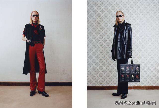 在穿搭中让服装以宽松廓形为꧃主,还有和其他的颜色或者是面料之间的搭配,比如:红色皮裤与黑色上衣的搭配,还有黑色皮革外套与其他面料的内搭与裤装的结合等等,都让皮革的穿搭更为丰富了一些。