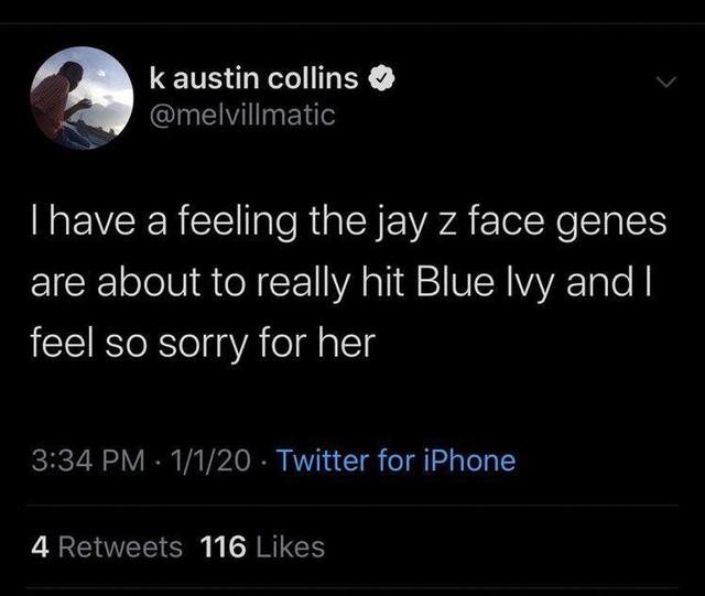 “我感觉,Blue Ivy以后肯定是越长越像Jay-Z了,我真是为这孩子感到悲哀。”