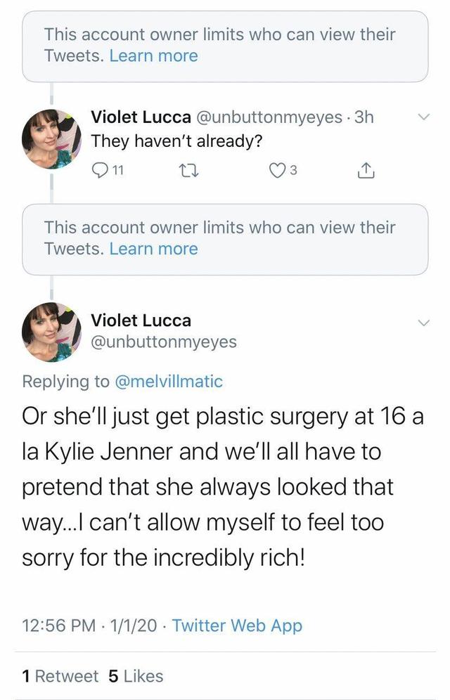 “也有可能她跟Kylie Jenner一样,十六岁就去整容,让我们只能假装不知道她整过,从小到大都长一个样了…”