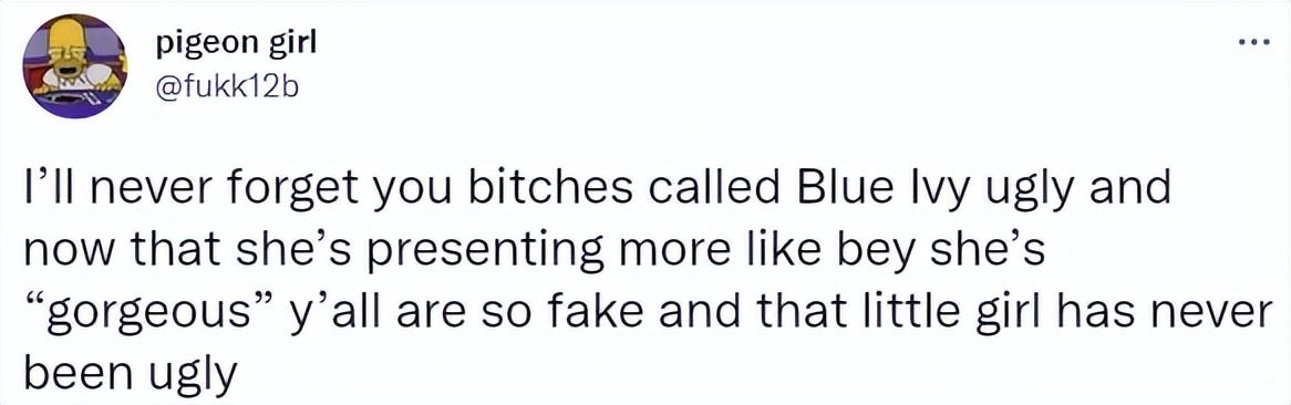 “我永远不会忘记你们这些人说Blue Ivy丑,现在她长得更像碧昂斯了,她就‘漂亮’了?