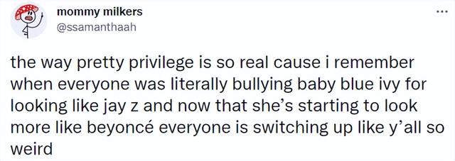 “美貌特权真的太真实了。我⛎🦋还记得互联网上几乎每个人都在霸凌婴儿Blue Ivy的时候,就因为她长得像Jay Z。