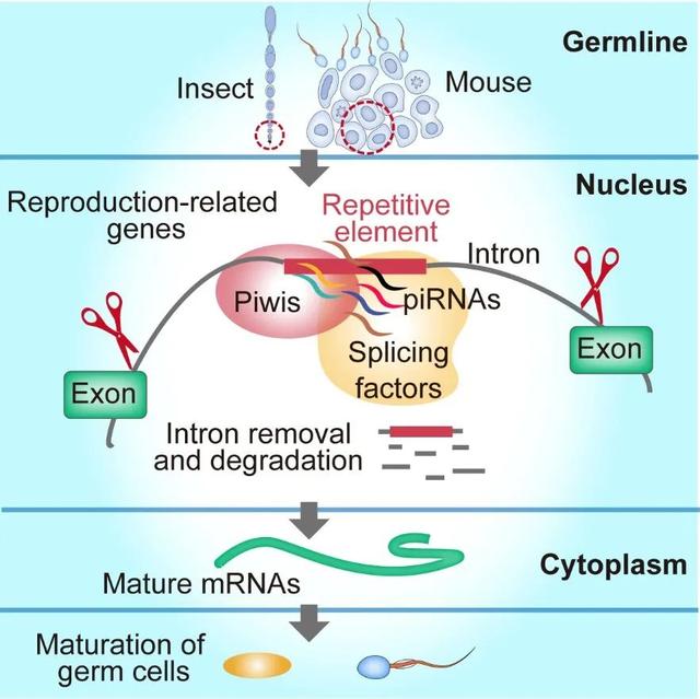 Piwi/piRNAs参与的前体mRNA剪切模式是否在动物界普遍存在?研究人员进一步在果蝇及小鼠生殖细胞系中,验证了Piwi蛋白和剪切体蛋白的互作以及piRNAs介导的mRꦬNA剪切机制的普遍性(图2)。这项研究也暗示了飞蝗中发现的Piwi/piRNAs介导的编码基因mRNA🎶剪切新机制可能在其它动物调节繁殖对策中也是普遍存在的。