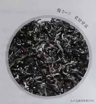 5)乌龙。乌龙的品质特点;条索瘦小,头尾尖,重量轻,梗短小,色海褐,少鲜润;冲泡后,有焦糖香,滋味清纯稍薄ꦜ,汤色青黄、浅黄或橙黄,叶底叶张薄,叶脉浮现,锯齿粗钝。乌龙如图2-🅘40所示。