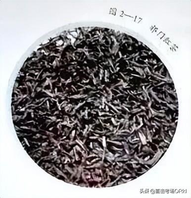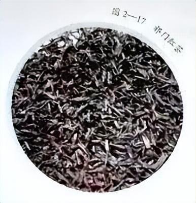 祁红的品质特点∶条索紧秀而稍弯曲,,有锋苗;色泽乌黑泛灰光,俗称"宝光"。冲泡后,香气浓郁高长,有蜜糖香,蕴含兰花香,且滋味醇厚,回味隽永,汤色红艳、明亮,叶底鲜红嫩软。祁门红茶如图2—17 所示。