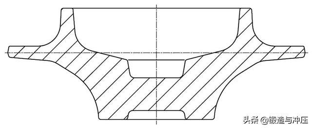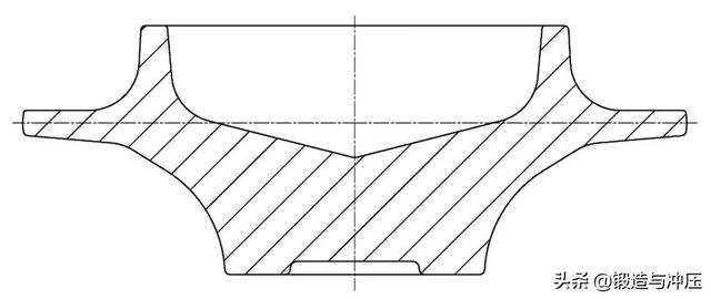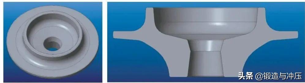 根据产品图及模锻成形工艺分析设计锻件图,依据锻件最大外形轮廓及保证锻件能从模膛中出模的分模原则,锻件分模面设计在盘部中间位置,这样设计的好处🐻是切边后较容易检查锻件错移量,防止切边后产生纵向毛刺,增加打磨工作量,还能消除锻件翘曲变形,最终决定分模面设计在盘部中间偏下位置2/5处;环形凸环设计在上模,上模金属在成形过程中流动较快且具有反挤压作用,更容易充满整个较窄环部;考虑到锻件生产低成本要求,降低上模高度尺寸,减少模块浪费,中间🐼孔连皮设计成斜底连皮并且位于偏上位置,需要在切边时把中间孔斜底连皮冲下来形成通孔,初始模锻工艺方案锻件结构确定为图2所示。