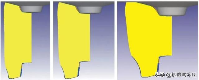 根据第一次样件调试结果情况分析,折纹比例达到了20%,后续需要进行调质处理。折纹隐患很可能引起淬火裂纹延伸,导致锻件报🥀废,为了完全消除折叠质量隐患及降低操作工打磨劳动强度,对模锻成形工艺进行改进。改进后锻件结构如图8所示,上模中间圆形凸台取消,改成整体圆锥,这样改善了金属🔯流动趋势。经过再次有限元模拟分析得知,整个模锻成形过程中金属流动不再出现折叠现象,折叠质量隐患得到完全消除。经过几个批次的批量生产验证,没有出现折叠质量隐患,锻件质量得到可靠保证。