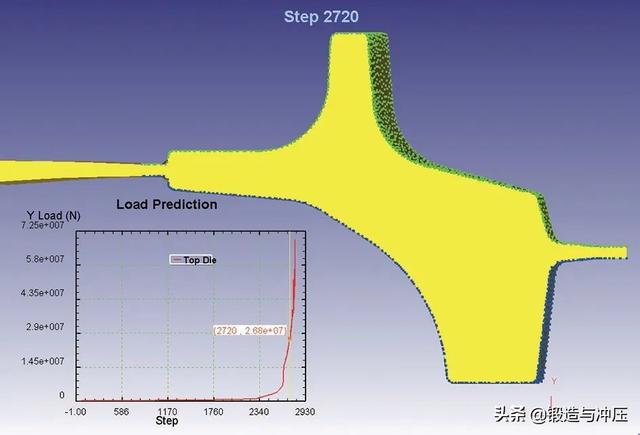 图5为模锻成形过程中上模所受载荷变化曲线走势,在锻造过程中,随着🧔坯料变形量的增加,上模所受载荷不断增加,在锻造末期即最外侧飞边刚形成时,模具型腔即将充满,上模所受载荷急剧增大。这时锻模型腔逐渐形成封闭空间,由于固体不可压缩,且多余的坯料逐渐开始往外流动形成飞边,需要较大的锻打压力把多余的金属排出模具型腔使锻件厚度尺寸达到要求。因此,上模载荷急剧增加,直至锻打结束,载荷达到最大值。