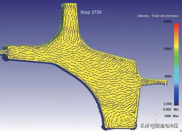 图6为模锻成形结束时金属流动趋势,上模金属流动趋势大体呈现出由上向下及向外侧,下模金属流动趋势大体呈现出由内向外,这是因为锻件外侧盘部比较薄,金属流动较慢𝕴,此处最后充满型腔,并且多余的金属需要流出模具型腔形成飞边,金属流动趋势符合镦粗成形工艺要求,满足锻件使用要求。