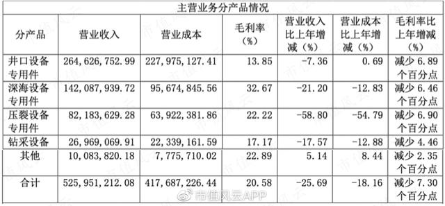 2020年营业收入为7.08🅺亿,同比增长2.05%;2021年营业收入为5.28亿,同比减少25.69%,其中井口设备专用件、深海设备专用件、压裂设备专用件收入占比分别为49.1%、26.4%、15.1%。