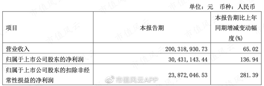 其中,营业收入为2亿,同比增长65.02%;扣非归母净利润为2387万,同比增长281.39%。