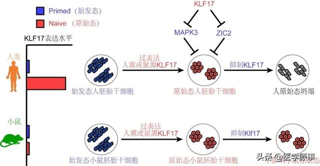 KLF17 在人类而非小鼠原始态胚胎干细胞中高表达。小鼠或人类 KLF17 的过表达均可以促进这两个种属的原始态多能性。然而,KLF17仅是维持人类胚胎干细胞原始态多能性所必需的。机制上,KLF17 直接抑制原始态多能性的负调节因🔜子MAPK3 和 ZIC2 的表达。