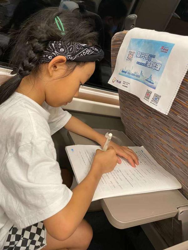 刘子涵赛后在返回长沙的途中写作业。刘子涵母亲供图