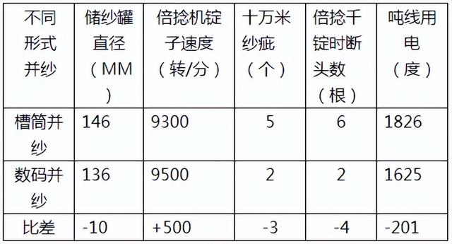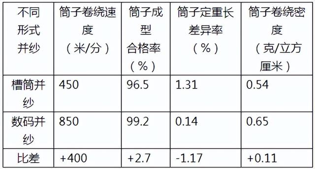 由于槽筒并纱与数码并纱后筒子,品种为T40S/2,单只筒🉐子重量为1.40公斤,分别到同型号倍捻🔴机生产进行比较,结见表3。